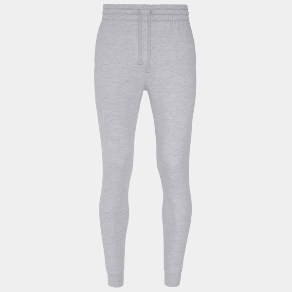 Heather grey 75% cotton/25% polyester. Soft cotton faced fabric. Brushed back fleece. Modern tapered slim fit. Elasticated waistband with drawcord. Two side pockets. Ribbed cuffed leg ends. Tear out label.