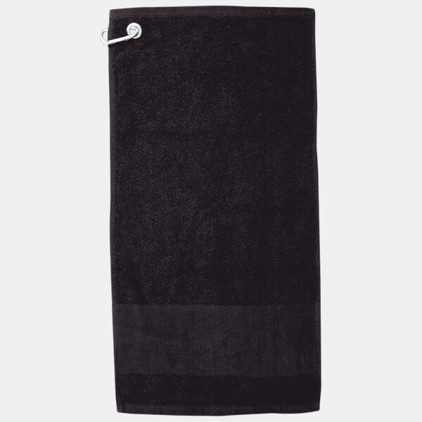 Golf towel with 10cm herringbone border for easy decoration. Metal rivet in corner of top edge.