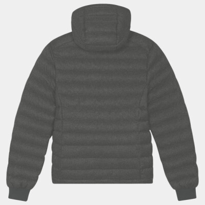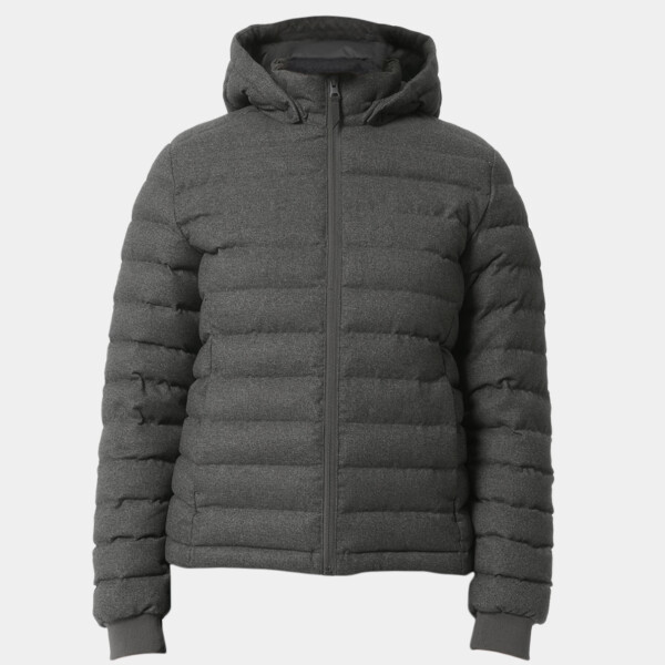 Wool-like women’s padded jacket. Set-in sleeve. High collar with detachable hood and matte metal hidden snaps. Hood opening and bottom hem with adjustable plastic stopper and elastic cord. Reverse nylon zip at centre front. Zipped welt pockets with extra grosgrain pull. Fully quilted. Side panels for better shape. Soft 1x1 rib at sleeve hem.
