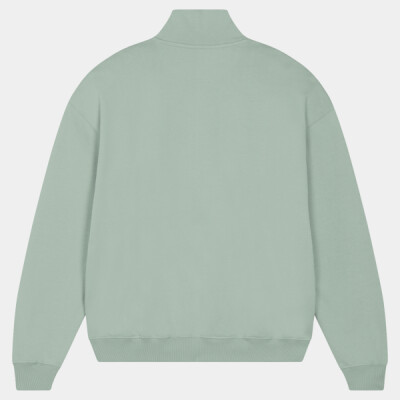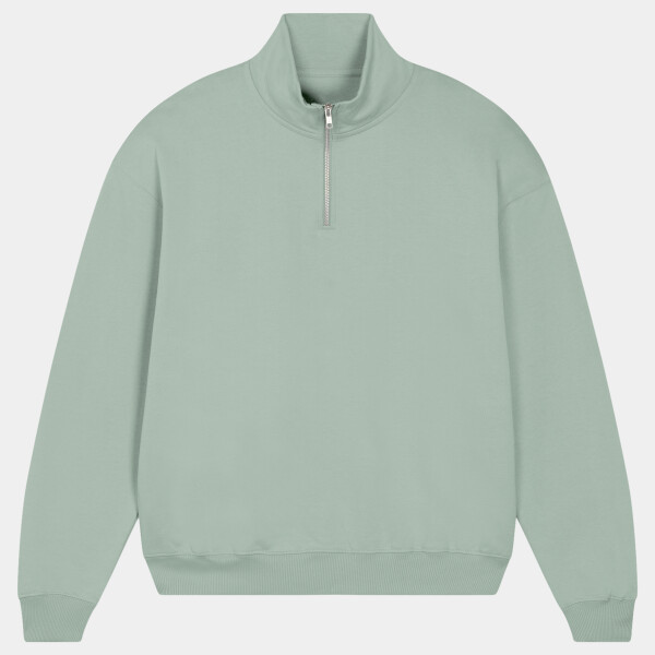 Unisex boxy dry hand feel quarter zip sweatshirt. Set-in sleeve. Neck collar in self-fabric. Herringbone tape at inside back neck and at inside of zip. Quarter zip at centre front. 2x1 rib at sleeve hem and bottom hem. Armhole, sleeve hem and bottom hem with twin-needle topstitch.