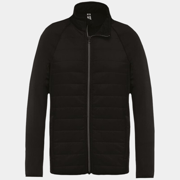 Polyamide ripstop quilted body. 90% polyester/10% elastane sleeves, sides and back. Polyester padding. Showerproof. Full length contrast zip. Two front zip pockets. Elasticated bound collar, cuffs and hem. Access for decoration.