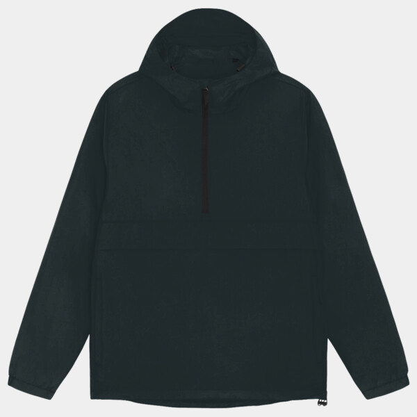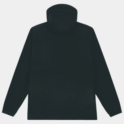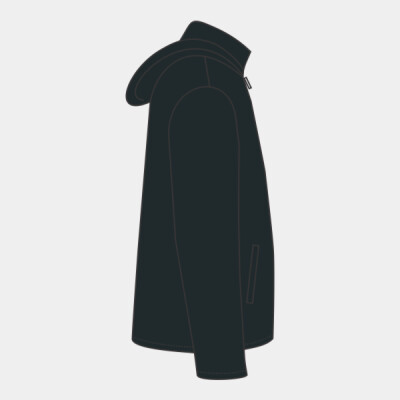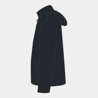 Longer back length with curved hem for protection. Bottom hem and hood with adjustable plastic stopper and elastic cord. Sealed hood visor. Zipped welt pockets. Non-functional flap, front and back. Self-fabric half-moon at back neck. Inside zip opening at bottom hem and inside loop, with snap at armhole providing easy access for chest decoration.