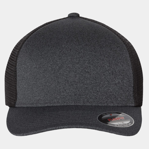 Two-tone, unipanel trucker cap with Flexfit technology, polyester mesh, mottled front, seamless front, pre-curved, and eightfold quilted visor.