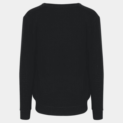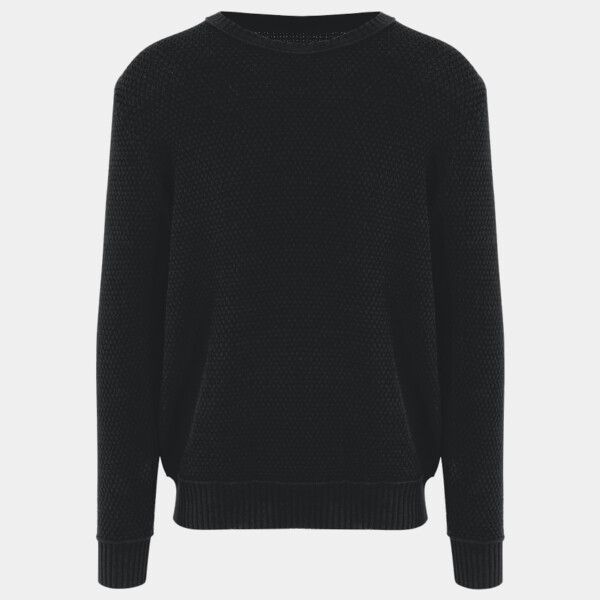 Regenerated cotton blended with recycled polyester sweater. Seed stitch knit with rib neck, cuffs and hem.