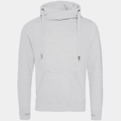 Heavyweight hoodie. Cross over neck detail. Twin needle stitching detail. Three panel double fabric hood. Flat lace drawcords. Kangaroo pouch pockets. Ribbed cuffs and hem. Soft cotton faced fabric created ideal printing surface. Simple tear out label makes it perfect for rebranding. Brushed inner fleece. Thumb holes in the cuffs.