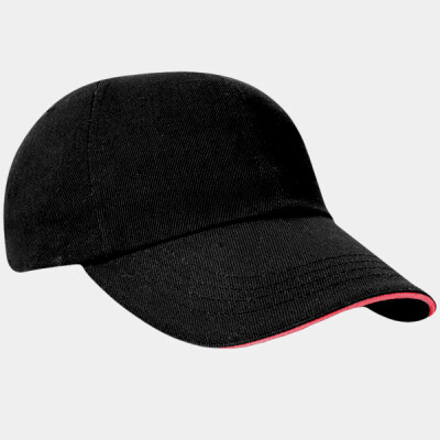 6 Panel. Unlined. Low profile. Unsupported front panels. Pre-curved peak with 4 stitch lines. Stitched eyelets. Contrasting colour sandwich peak. Fabric size adjuster with antique brass buckle.