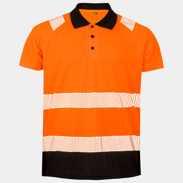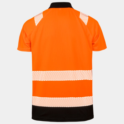 Top stitched shoulder and sleeve detail. Easy-stretch, printed safety bands. Contrast black panel and collar. 3-button placket with spare button. Stretch ribbed collar. Innovative dark panel design to mask grime. Made from highest quality yarns. EN ISO 20471: 2013 + A1:2016 Class 2 / Ris-3279-Tom Class 2 (orange only).