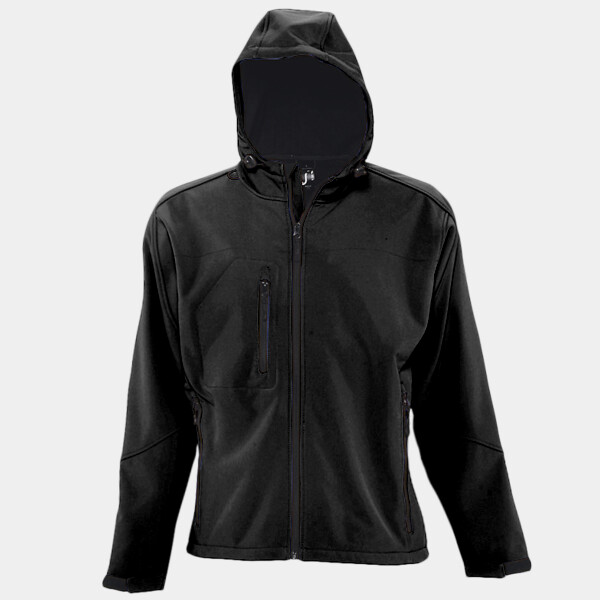 Three layer stretch soft shell. 94% polyester/6% elastane outer. Polyester fleece backed. Showerproof, windproof and breathable. Shaped fit. Taped neck. Hood with adjustable drawcord. Collar high full length zip with chin guard and inner zip guard. Right chest zip pocket. Two front zip pockets. Tear release adjustable cuffs. Adjustable drawcord hem. Drop hem. Access for decoration.