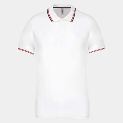 3 button placket. Contrast taped neck and side vents. Flat knit rib with contrast piping at neck and cuffs. Twin needle finishing.