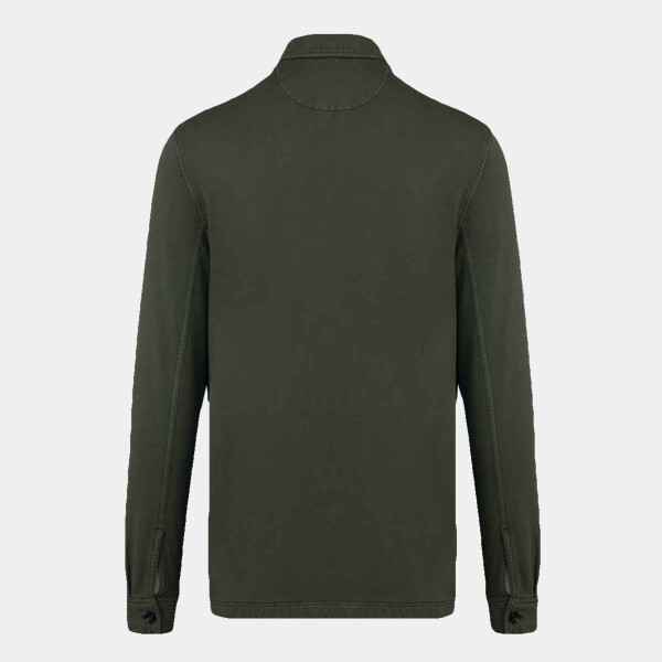 100% organic combed cotton. Brushed back fleece. Washed effect. Regular fit. Collar stand. Herringbone taped neck. Contrast recycled plastic horn effect buttons. Back yoke. Two chest pockets with flap and button closure. Single button cuffs. Straight hem. Twin needle hem. Tag free. Garment dyed after assembly, colours may vary slightly. The colour may rub off on contact with light surfaces or clothing.