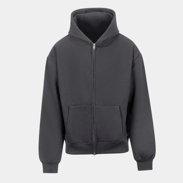 Oversized fit. Heavyweight. Three-panelled double-fabric hood. Double-end YKK zip. No drawcords. Ribbed cuffs and hem. Brushed inner fleece. Tear-away label. Contains recycled polyester.