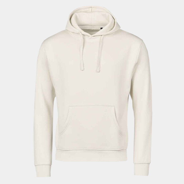 70% organic ringspun cotton/30% recycled polyester. Doubled dyed. Silicone treatment. Brushed back fleece. Drop shoulder style. Relaxed fit. Two panel layer hood with self colour drawcord. Half moon. Front pouch pocket. Ribbed cuffs and hem with elastane. Tag free. 60°C wash.