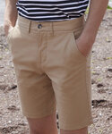 Flat front chino short, tag free, stretch fabric for ease of movement. Slanted front pockets, 2 back welt pockets, belt loops plain hem.