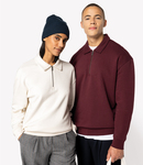 85% organic combed cotton/15% recycled polyester. Brushed back fleece.Enzyme washed.Drop shoulder style.Straight fit.Jersey taped neck.Zip neck with recycled metal zip.Half moon back yoke.1x1 ribbed cuffs and hem.Tag free.Recycled polyester is made from post-consumer waste.
